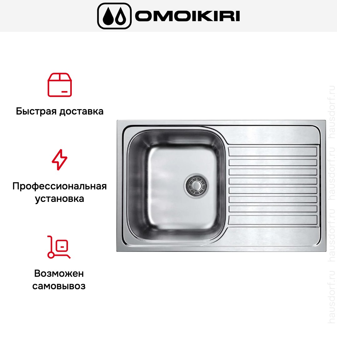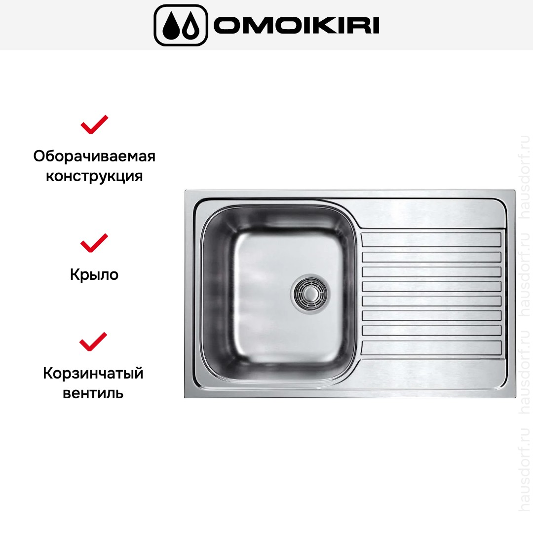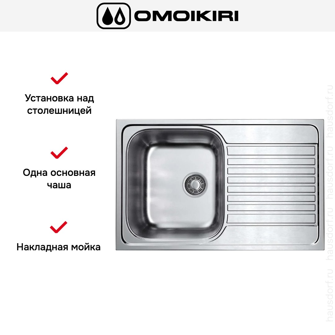 Накладная мойка Omoikiri — отличный выбор для тех, кто хочет создать гармоничное пространство с удобной сантехникой. простой в установке. Преимущество такой конструкции: легко подобрать практически к любой кухне и не придется демонтировать вместе с тумбой при ремонте или перестановке остальной мебели. Данная модель имеет стандартную форму, поэтому подходит большинству пользователей. Устанавливается над столешницей: это самый простой способ монтажа, зачастую с ним можно справиться даже без специалистов, главное — правильно рассчитать размеры ниши.