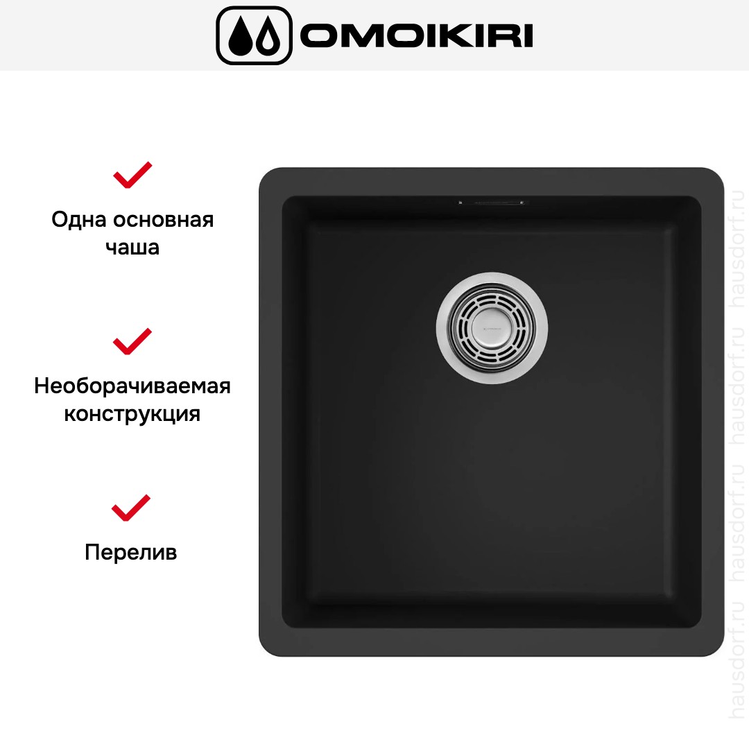 Мойка Omoikiri Kata 40-U BL — врезная модель с установкой под столешницу, выполненная в строгом квадратном силуэте и глубоком черном оттенке. Она занимает минимум места на кухне при габаритах 40×42 см, сохраняя привлекательный внешний вид и сдержанную эстетику. Компактность делает её идеальной для небольших зон или встраивания в модульную мебель.
