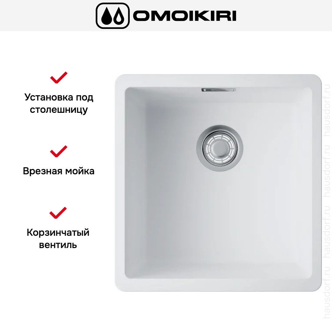 - Монтаж под столешницу: кромка скрыта, на виду лишь четкая квадратная чаша белого цвета.