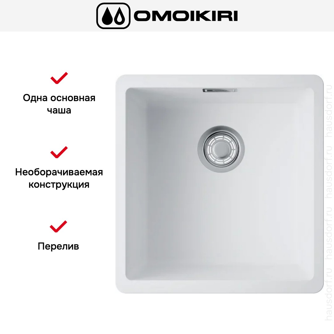 Необорачиваемую мойку можно установить только в одном положении — поэтому при наличии крыла необходимо заранее продумать, как вы хотите ее разместить. Модель имеет одно отверстие для смесителя, может быть разной формы — круглой, квадратной, прямоугольной и нестандартной. Изготавливаются из разных материалов.