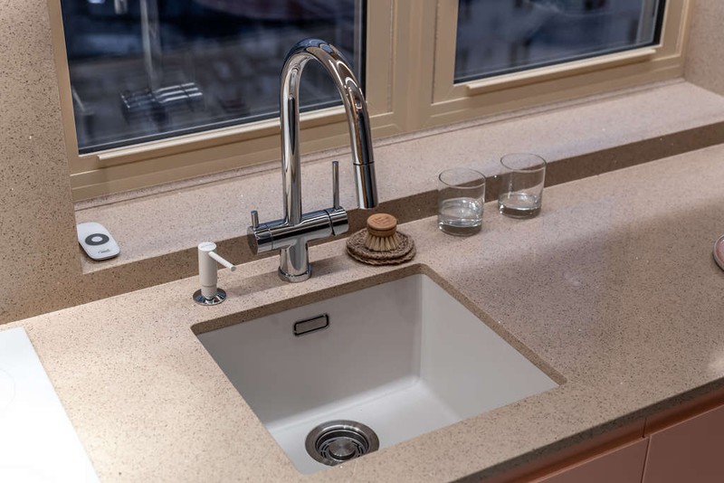 вровень со столешницей — создается ощущение бесшовного пространства, а если мойка сделана из того же материала, то и единого дизайна;