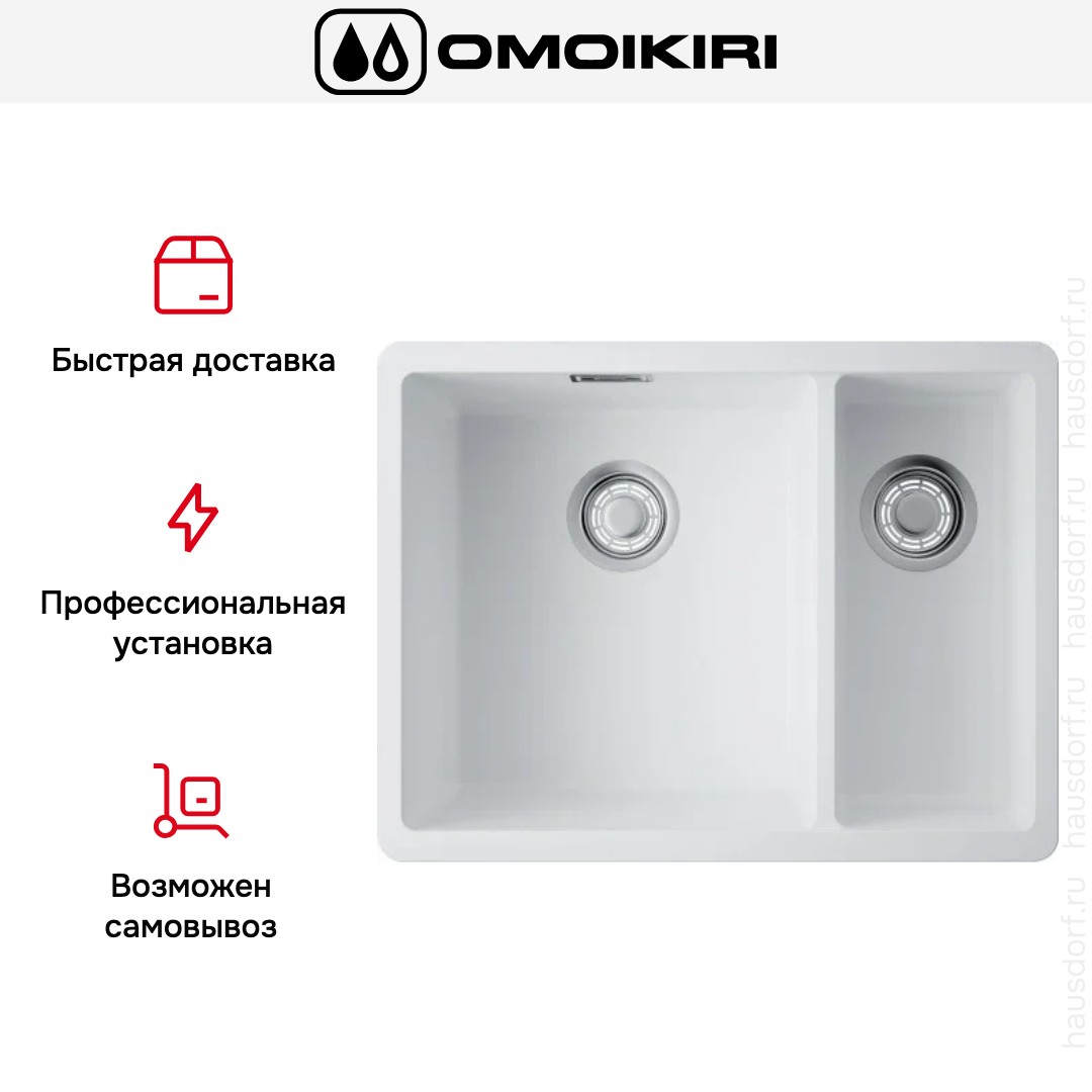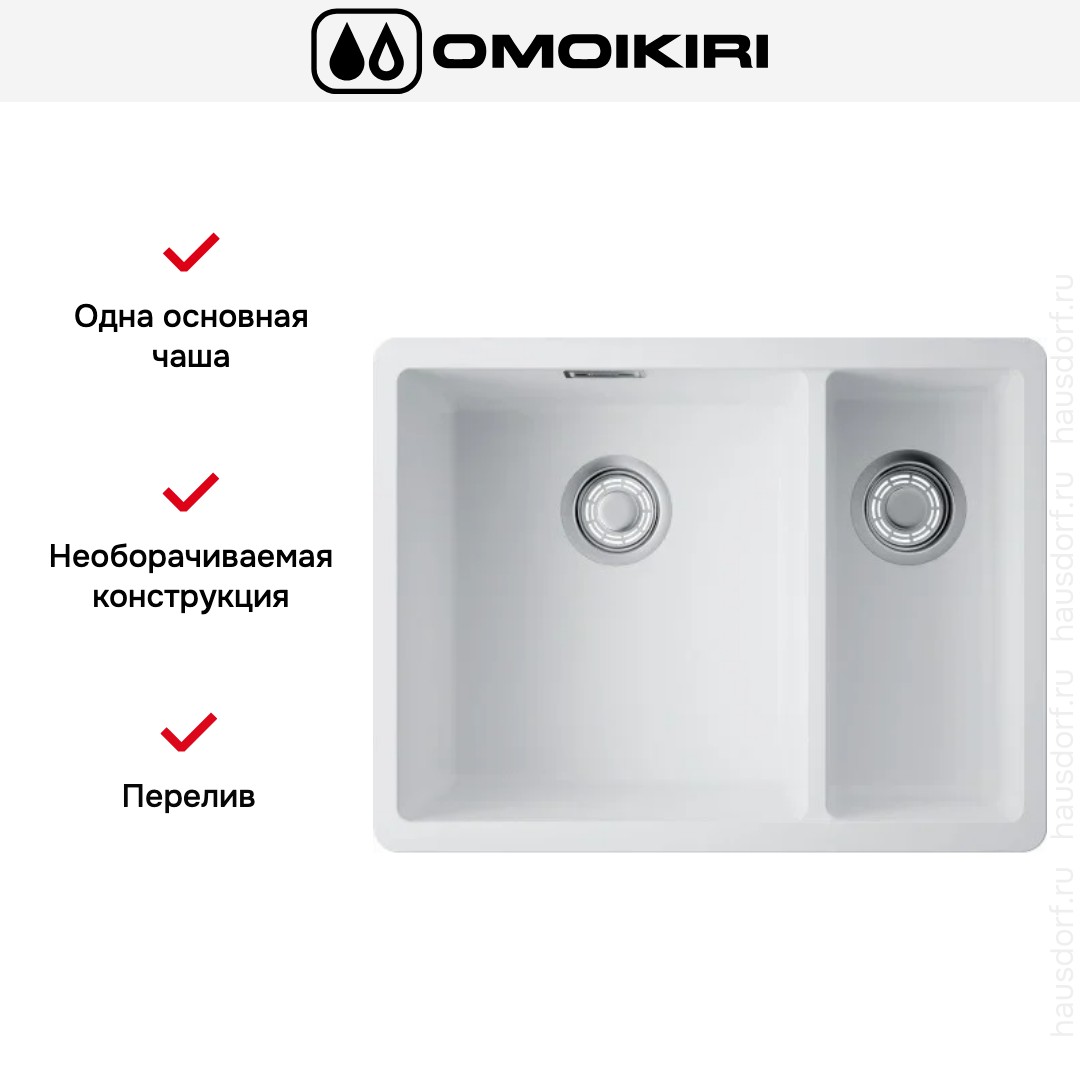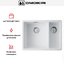 Выглядит лаконично и строго: прямоугольная форма, две продолговатые чаши в единой конструкции, универсальный белый цвет. Формат встраивания под столешницу создает ровную линию рабочей поверхности — без выступов и визуального «разрыва» между мойкой и поверхностью стола.