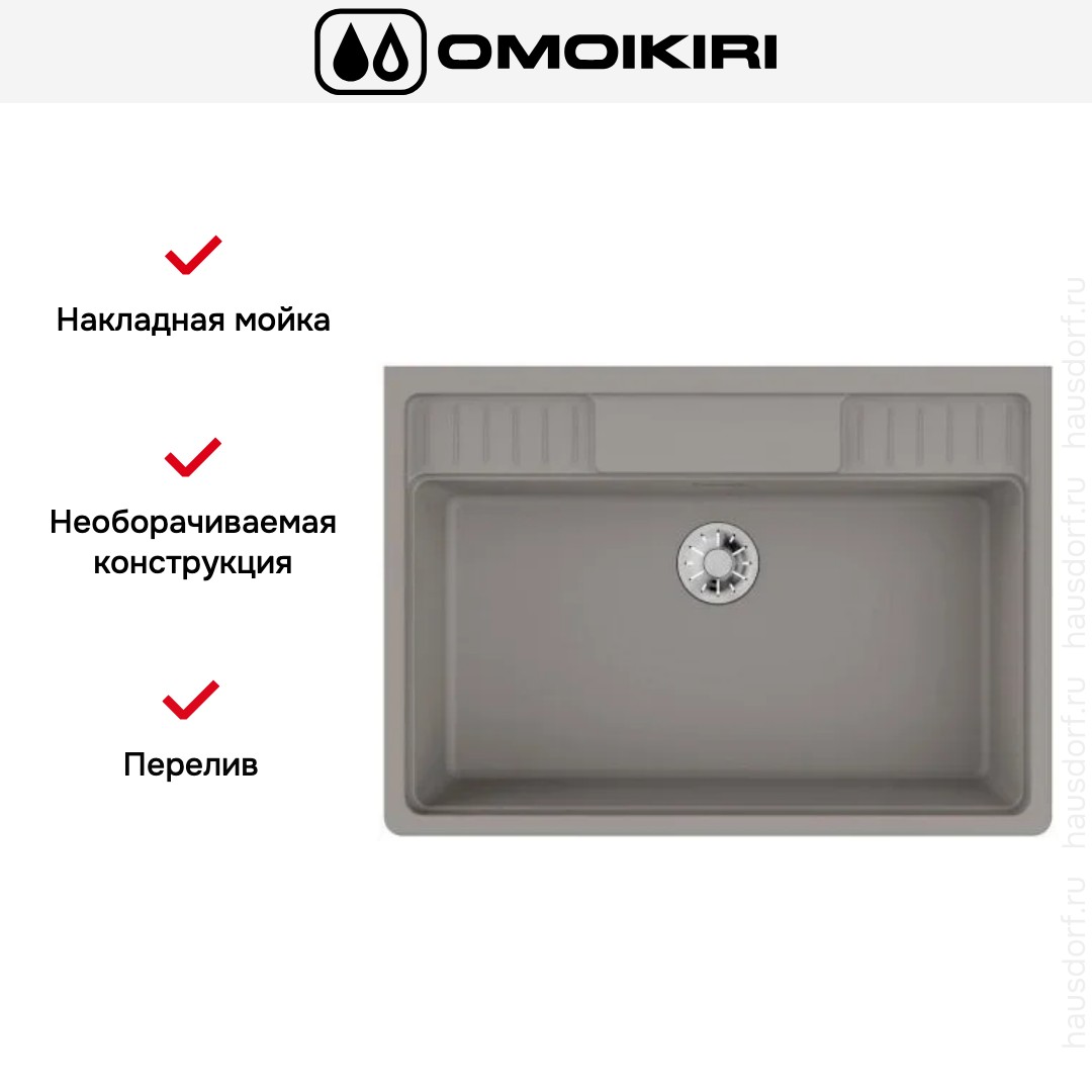 Накладная мойка Omoikiri — отличный выбор для тех, кто хочет создать гармоничное пространство с удобной сантехникой. простой в установке. Преимущество такой конструкции: легко подобрать практически к любой кухне и не придется демонтировать вместе с тумбой при ремонте или перестановке остальной мебели. Данная модель имеет стандартную форму, поэтому подходит большинству пользователей. Устанавливается над столешницей: это самый простой способ монтажа, зачастую с ним можно справиться даже без специалистов, главное — правильно рассчитать размеры ниши.