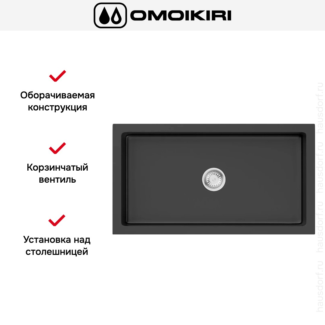 Мойка OMOIKIRI Mikura 76 BL — модульная прямоугольная мойка для установки над столешницей, выполненная в строгом черном цвете. Дизайн выдержан в минималистской эстетике, где четкие геометрические линии дополняются глубокой основной чашей. Черная поверхность добавляет кухонному пространству солидности и легко сочетается с современными фасадами и столешницами.