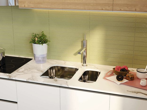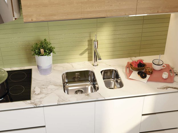 вровень со столешницей — создается ощущение бесшовного пространства, а если мойка сделана из того же материала, то и единого дизайна;