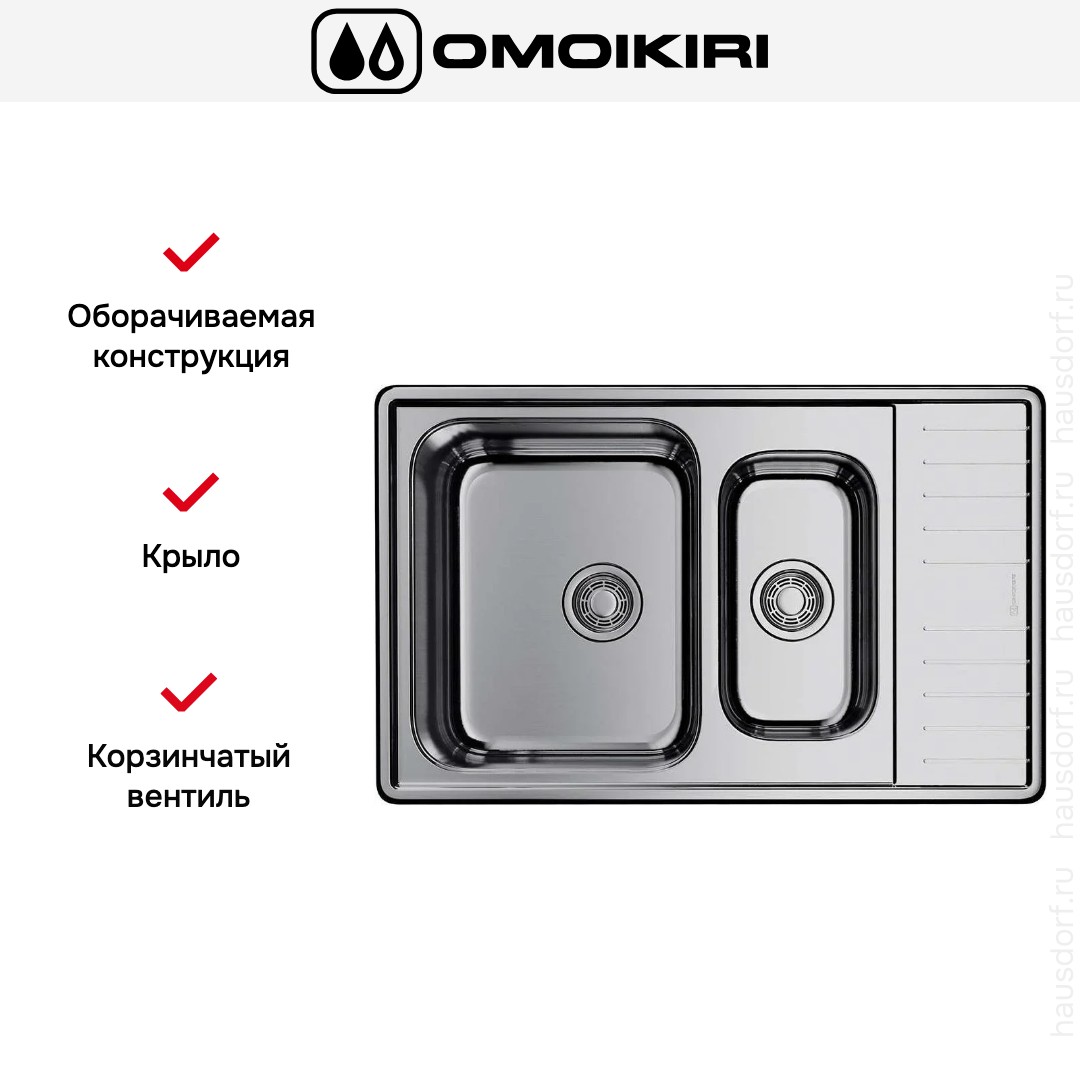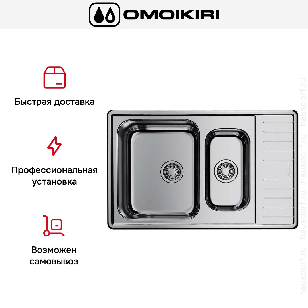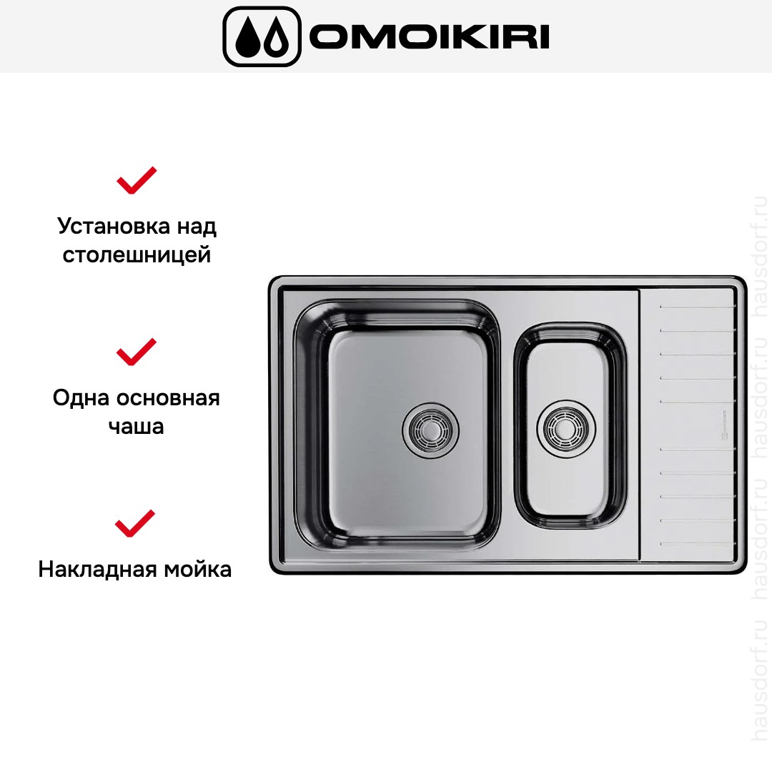 Накладная мойка Omoikiri — отличный выбор для тех, кто хочет создать гармоничное пространство с удобной сантехникой. простой в установке. Преимущество такой конструкции: легко подобрать практически к любой кухне и не придется демонтировать вместе с тумбой при ремонте или перестановке остальной мебели. Данная модель имеет стандартную форму, поэтому подходит большинству пользователей. Устанавливается над столешницей: это самый простой способ монтажа, зачастую с ним можно справиться даже без специалистов, главное — правильно рассчитать размеры ниши.