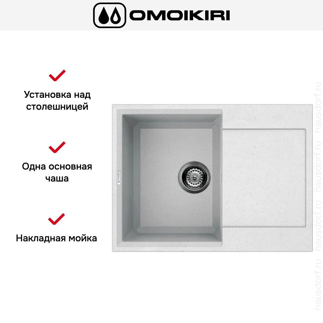 Накладная мойка Omoikiri — отличный выбор для тех, кто хочет создать гармоничное пространство с удобной сантехникой. простой в установке. Преимущество такой конструкции: легко подобрать практически к любой кухне и не придется демонтировать вместе с тумбой при ремонте или перестановке остальной мебели. Данная модель имеет стандартную форму, поэтому подходит большинству пользователей. Устанавливается над столешницей: это самый простой способ монтажа, зачастую с ним можно справиться даже без специалистов, главное — правильно рассчитать размеры ниши.