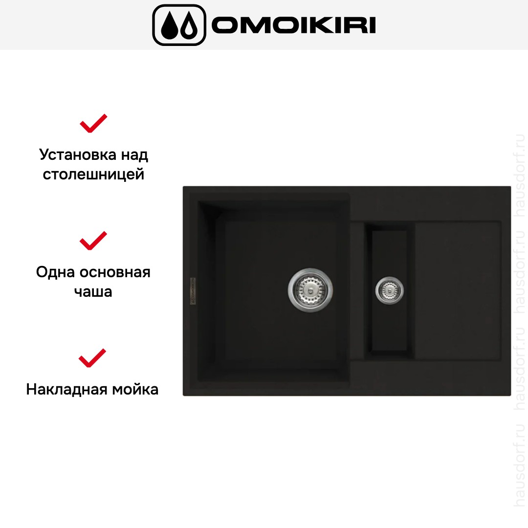 Накладная мойка Omoikiri — отличный выбор для тех, кто хочет создать гармоничное пространство с удобной сантехникой. простой в установке. Преимущество такой конструкции: легко подобрать практически к любой кухне и не придется демонтировать вместе с тумбой при ремонте или перестановке остальной мебели. Данная модель имеет стандартную форму, поэтому подходит большинству пользователей. Устанавливается над столешницей: это самый простой способ монтажа, зачастую с ним можно справиться даже без специалистов, главное — правильно рассчитать размеры ниши.