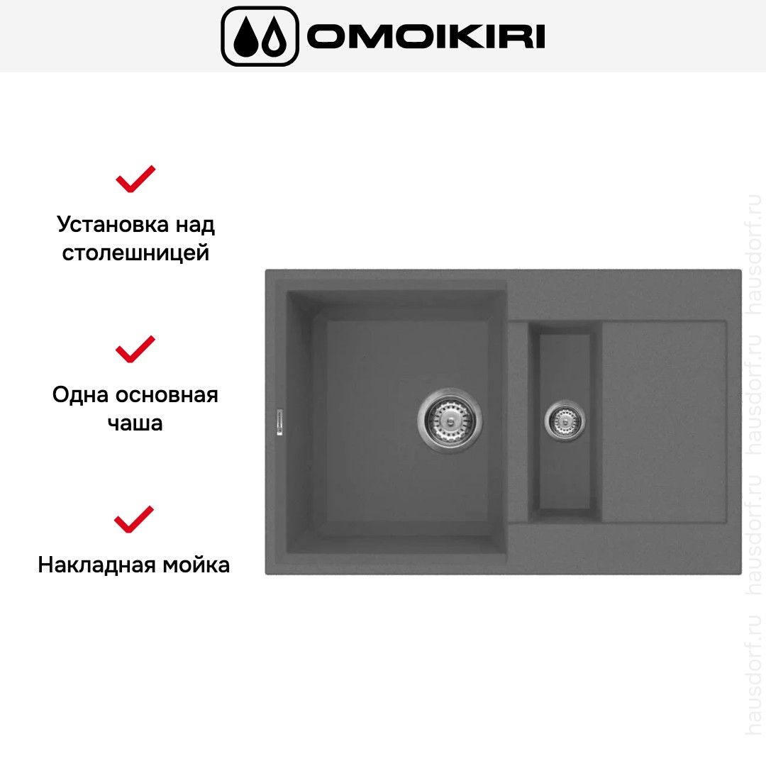 Накладная мойка Omoikiri — отличный выбор для тех, кто хочет создать гармоничное пространство с удобной сантехникой. простой в установке. Преимущество такой конструкции: легко подобрать практически к любой кухне и не придется демонтировать вместе с тумбой при ремонте или перестановке остальной мебели. Данная модель имеет стандартную форму, поэтому подходит большинству пользователей. Устанавливается над столешницей: это самый простой способ монтажа, зачастую с ним можно справиться даже без специалистов, главное — правильно рассчитать размеры ниши.