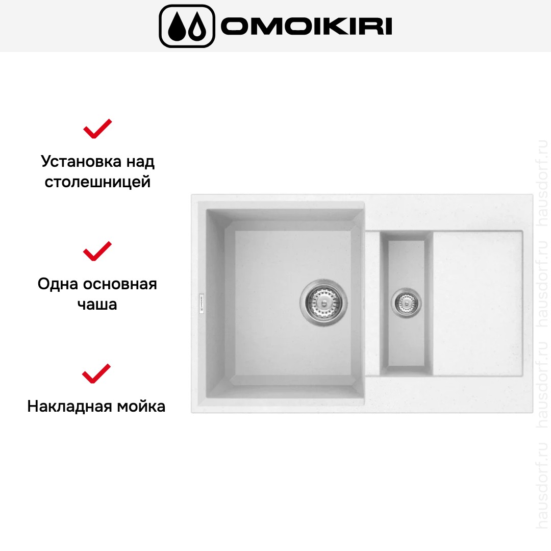 Накладная мойка Omoikiri — отличный выбор для тех, кто хочет создать гармоничное пространство с удобной сантехникой. простой в установке. Преимущество такой конструкции: легко подобрать практически к любой кухне и не придется демонтировать вместе с тумбой при ремонте или перестановке остальной мебели. Данная модель имеет стандартную форму, поэтому подходит большинству пользователей. Устанавливается над столешницей: это самый простой способ монтажа, зачастую с ним можно справиться даже без специалистов, главное — правильно рассчитать размеры ниши.