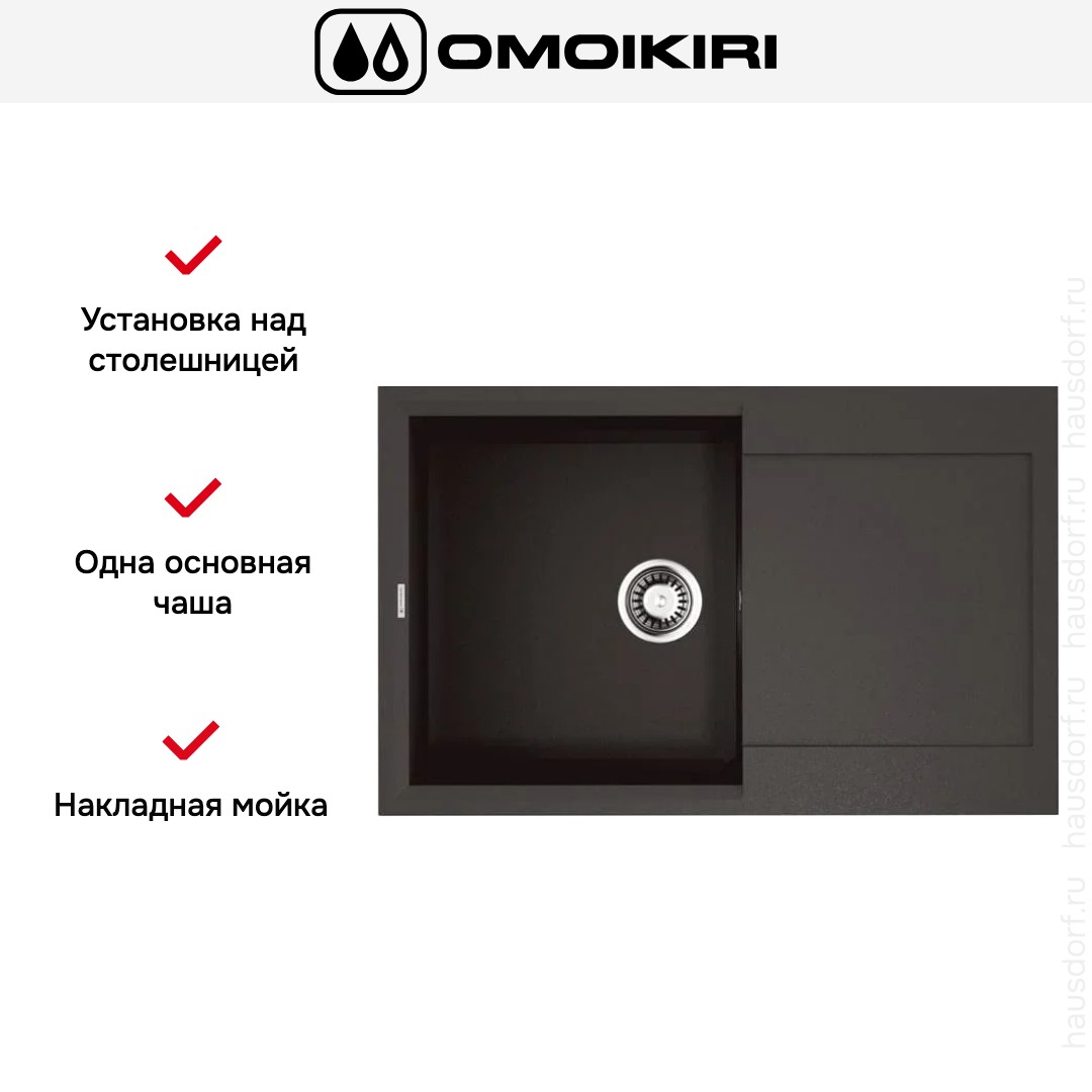 Накладная мойка Omoikiri — отличный выбор для тех, кто хочет создать гармоничное пространство с удобной сантехникой. простой в установке. Преимущество такой конструкции: легко подобрать практически к любой кухне и не придется демонтировать вместе с тумбой при ремонте или перестановке остальной мебели. Данная модель имеет стандартную форму, поэтому подходит большинству пользователей. Устанавливается над столешницей: это самый простой способ монтажа, зачастую с ним можно справиться даже без специалистов, главное — правильно рассчитать размеры ниши.