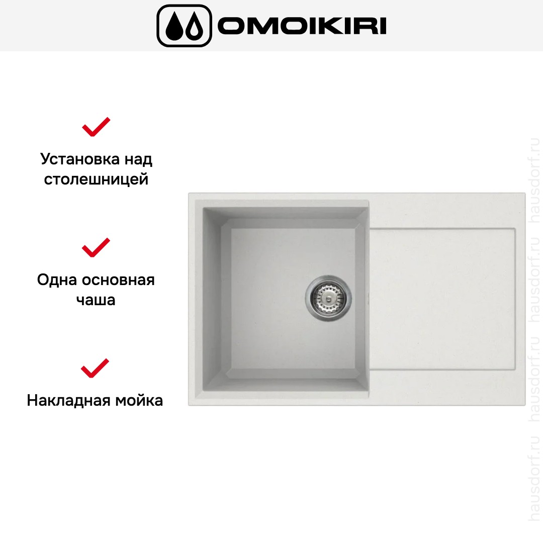 Накладная мойка Omoikiri — отличный выбор для тех, кто хочет создать гармоничное пространство с удобной сантехникой. простой в установке. Преимущество такой конструкции: легко подобрать практически к любой кухне и не придется демонтировать вместе с тумбой при ремонте или перестановке остальной мебели. Данная модель имеет стандартную форму, поэтому подходит большинству пользователей. Устанавливается над столешницей: это самый простой способ монтажа, зачастую с ним можно справиться даже без специалистов, главное — правильно рассчитать размеры ниши.