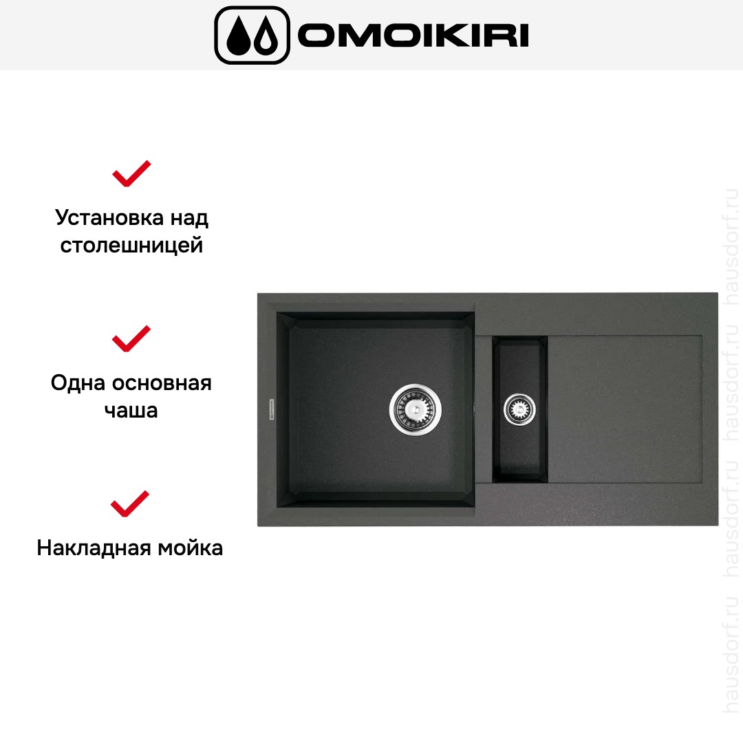 Накладная мойка Omoikiri — отличный выбор для тех, кто хочет создать гармоничное пространство с удобной сантехникой. простой в установке. Преимущество такой конструкции: легко подобрать практически к любой кухне и не придется демонтировать вместе с тумбой при ремонте или перестановке остальной мебели. Данная модель имеет стандартную форму, поэтому подходит большинству пользователей. Устанавливается над столешницей: это самый простой способ монтажа, зачастую с ним можно справиться даже без специалистов, главное — правильно рассчитать размеры ниши.