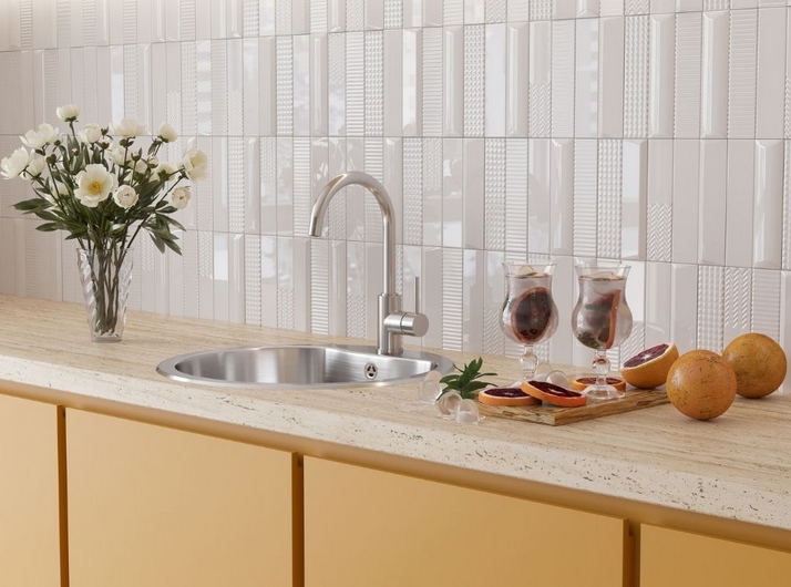 вровень со столешницей — создается ощущение бесшовного пространства, а если мойка сделана из того же материала, то и единого дизайна;