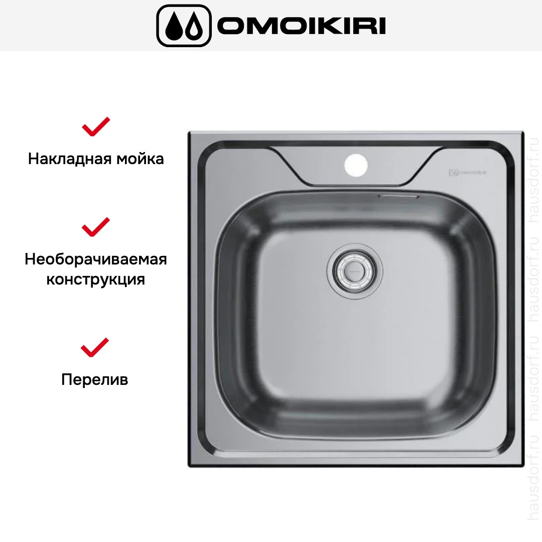 Накладная мойка Omoikiri — отличный выбор для тех, кто хочет создать гармоничное пространство с удобной сантехникой. простой в установке. Преимущество такой конструкции: легко подобрать практически к любой кухне и не придется демонтировать вместе с тумбой при ремонте или перестановке остальной мебели. Данная модель имеет стандартную форму, поэтому подходит большинству пользователей. Устанавливается над столешницей: это самый простой способ монтажа, зачастую с ним можно справиться даже без специалистов, главное — правильно рассчитать размеры ниши.