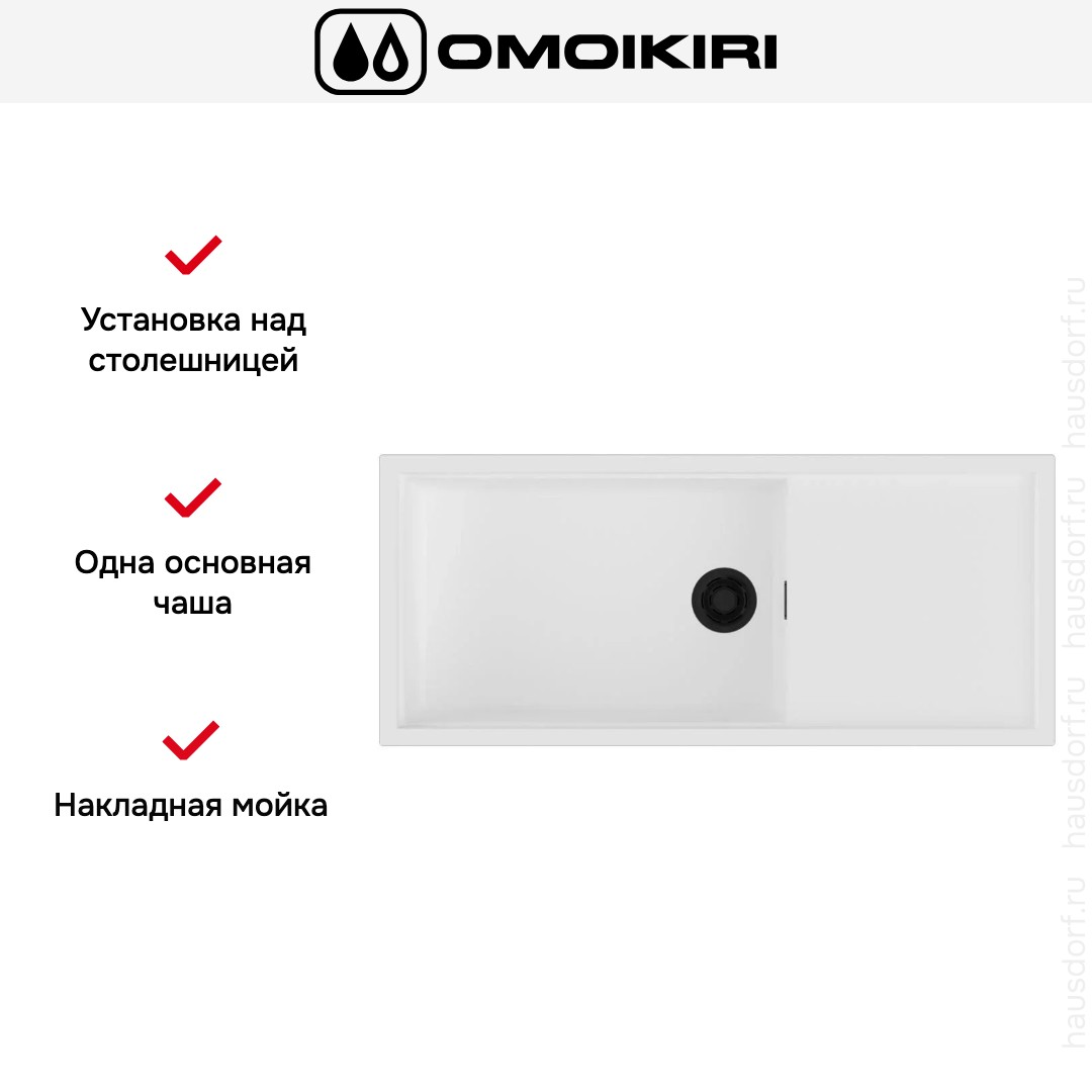 Накладная мойка Omoikiri — отличный выбор для тех, кто хочет создать гармоничное пространство с удобной сантехникой. простой в установке. Преимущество такой конструкции: легко подобрать практически к любой кухне и не придется демонтировать вместе с тумбой при ремонте или перестановке остальной мебели. Данная модель имеет стандартную форму, поэтому подходит большинству пользователей. Устанавливается над столешницей: это самый простой способ монтажа, зачастую с ним можно справиться даже без специалистов, главное — правильно рассчитать размеры ниши.