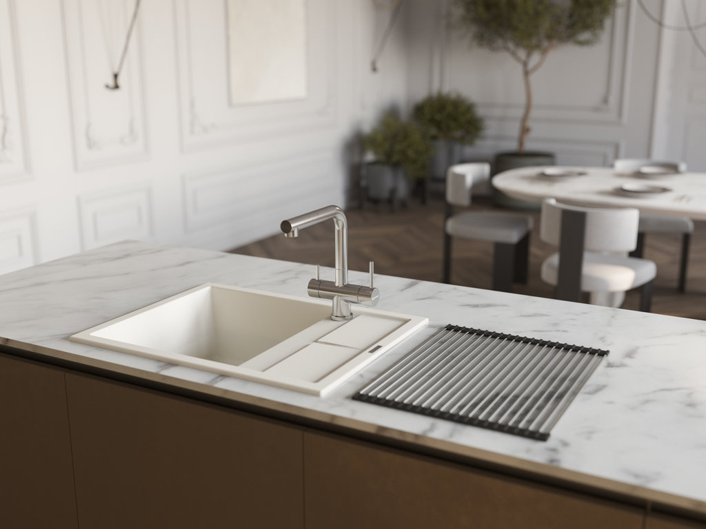 вровень со столешницей — создается ощущение бесшовного пространства, а если мойка сделана из того же материала, то и единого дизайна;