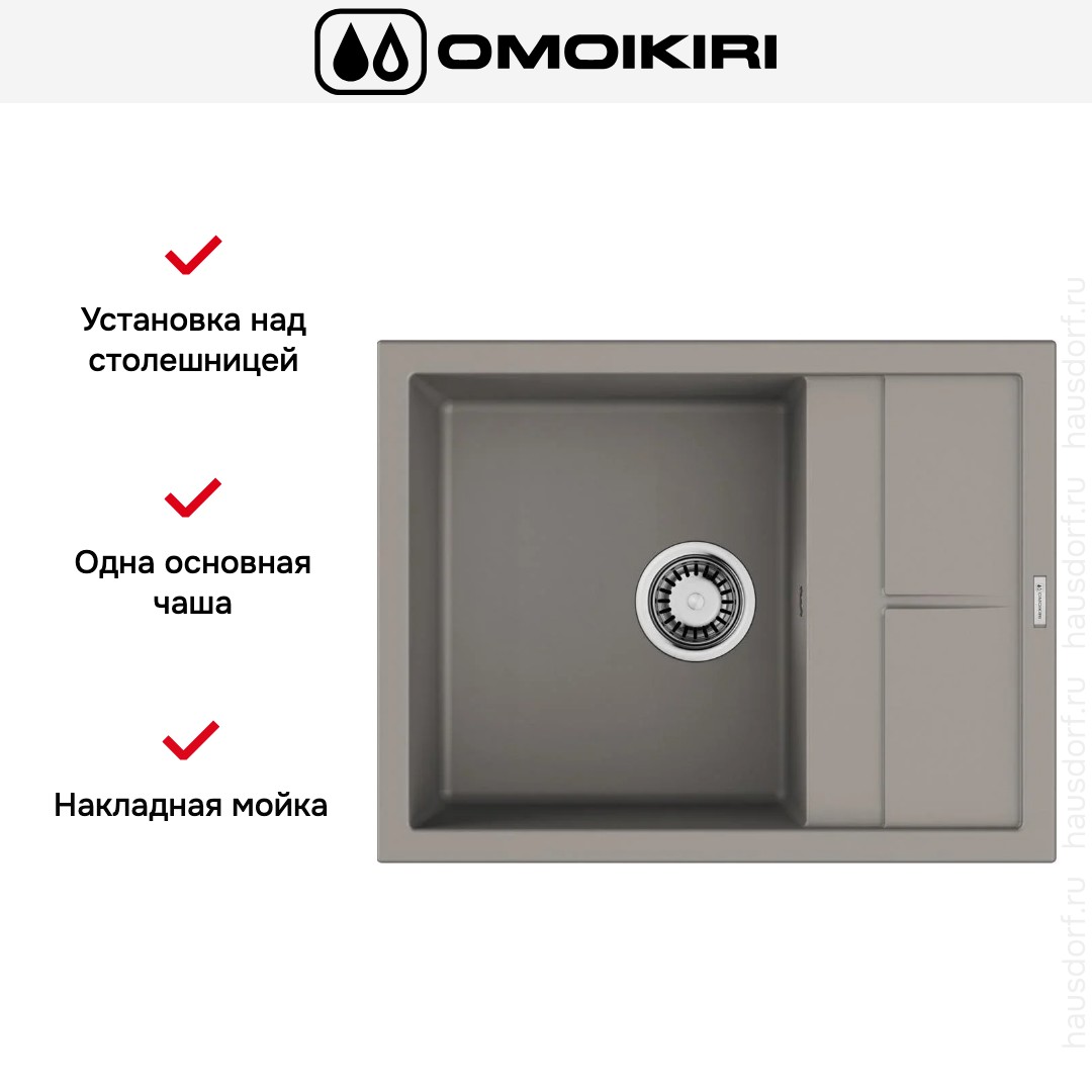 Накладная мойка Omoikiri — отличный выбор для тех, кто хочет создать гармоничное пространство с удобной сантехникой. простой в установке. Преимущество такой конструкции: легко подобрать практически к любой кухне и не придется демонтировать вместе с тумбой при ремонте или перестановке остальной мебели. Данная модель имеет стандартную форму, поэтому подходит большинству пользователей. Устанавливается над столешницей: это самый простой способ монтажа, зачастую с ним можно справиться даже без специалистов, главное — правильно рассчитать размеры ниши.
