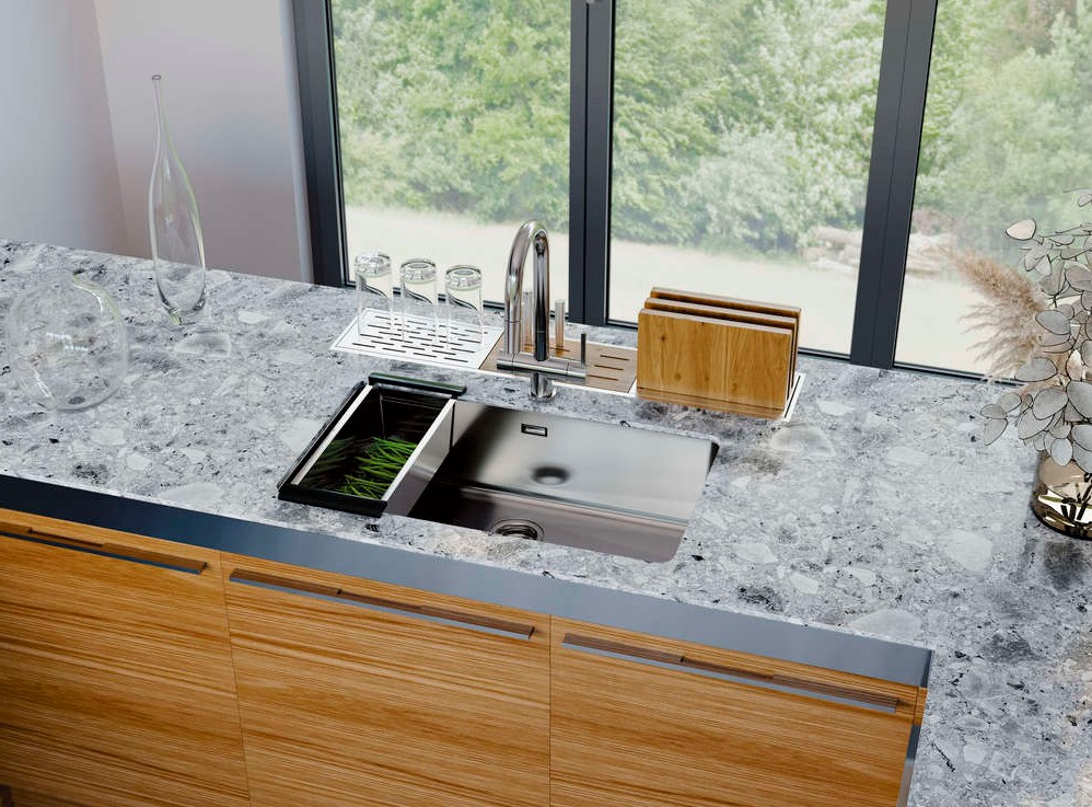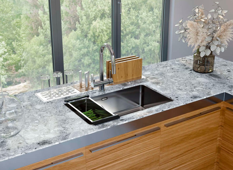 вровень со столешницей — создается ощущение бесшовного пространства, а если мойка сделана из того же материала, то и единого дизайна;