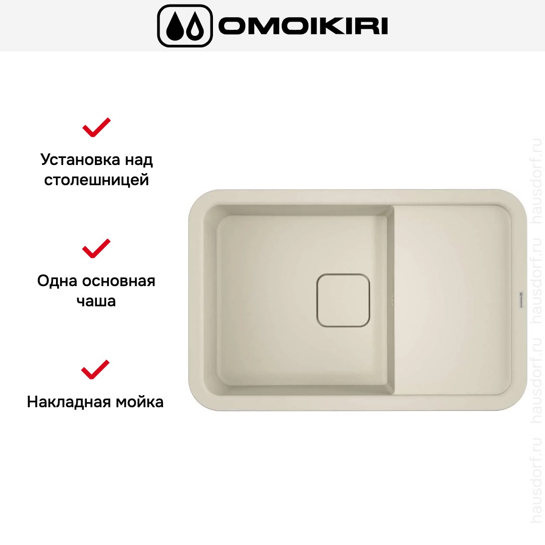 Накладная мойка Omoikiri — отличный выбор для тех, кто хочет создать гармоничное пространство с удобной сантехникой. простой в установке. Преимущество такой конструкции: легко подобрать практически к любой кухне и не придется демонтировать вместе с тумбой при ремонте или перестановке остальной мебели. Данная модель имеет стандартную форму, поэтому подходит большинству пользователей. Устанавливается над столешницей: это самый простой способ монтажа, зачастую с ним можно справиться даже без специалистов, главное — правильно рассчитать размеры ниши.