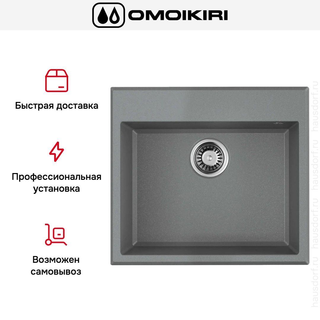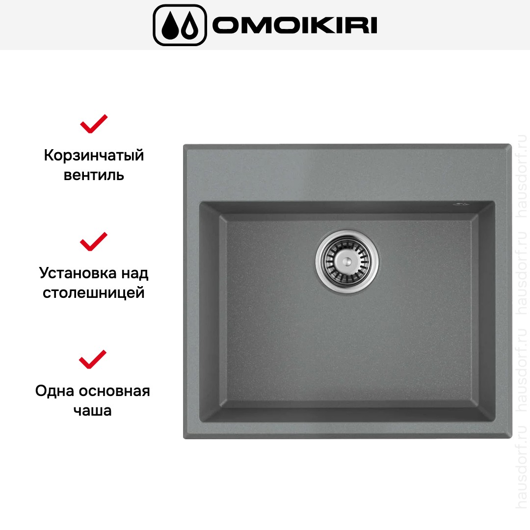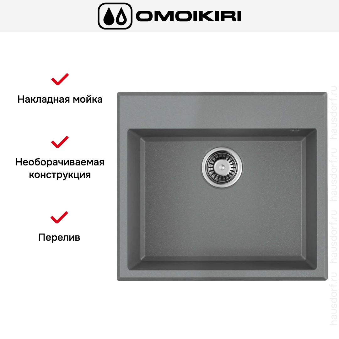 Мойка OMOIKIRI Tedori 57 GR — накладная прямоугольная модель, созданная для установки над столешницей и оптимизированная под тумбу шириной 60 см. Эта компактная конструкция имеет общие габариты 57×51 см и идеально впишется в кухню средней и малой площади. Необорачиваемый профиль задаёт фиксированную ориентацию, что важно учитывать при планировке рабочей зоны и размещении смесителя.