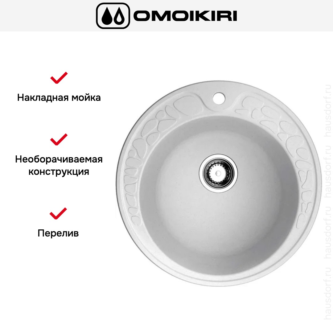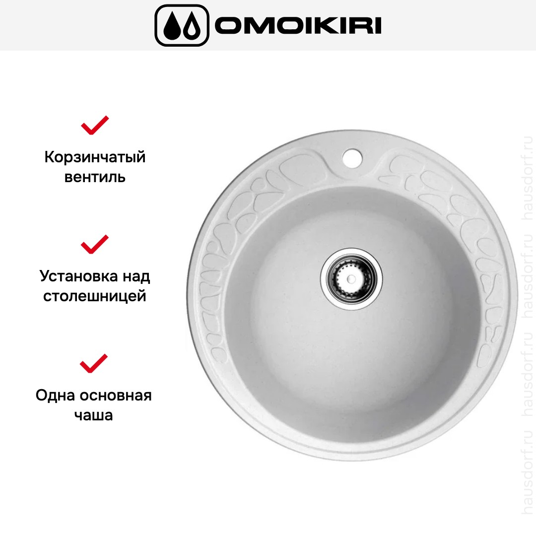 Накладная мойка Omoikiri — отличный выбор для тех, кто хочет создать гармоничное пространство с удобной сантехникой. простой в установке. Преимущество такой конструкции: легко подобрать практически к любой кухне и не придется демонтировать вместе с тумбой при ремонте или перестановке остальной мебели. Данная модель имеет скругленный контур, поэтому выбор тумбочки для нее потребует дополнительного внимания. Устанавливается над столешницей: это самый простой способ монтажа, зачастую с ним можно справиться даже без специалистов, главное — правильно рассчитать размеры ниши.