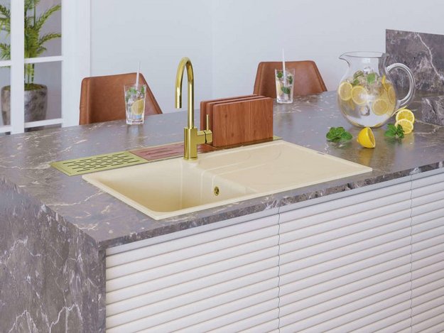 Интегрированная — встраиваемая модель из того же материала, что и столешница. Благодаря этому она выглядит как часть мебели.