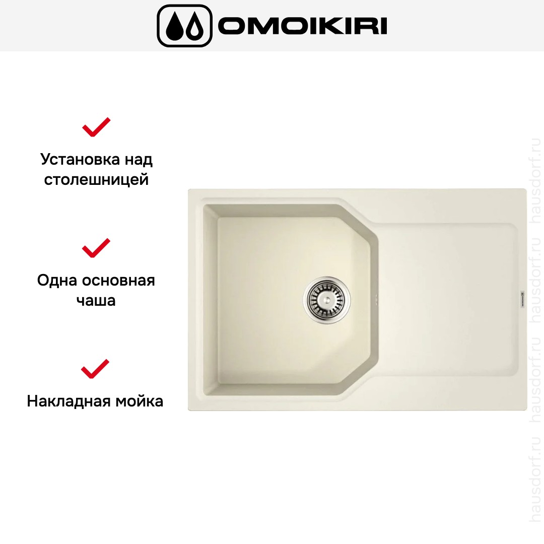 Накладная мойка Omoikiri — отличный выбор для тех, кто хочет создать гармоничное пространство с удобной сантехникой. простой в установке. Преимущество такой конструкции: легко подобрать практически к любой кухне и не придется демонтировать вместе с тумбой при ремонте или перестановке остальной мебели. Данная модель имеет стандартную форму, поэтому подходит большинству пользователей. Устанавливается над столешницей: это самый простой способ монтажа, зачастую с ним можно справиться даже без специалистов, главное — правильно рассчитать размеры ниши.