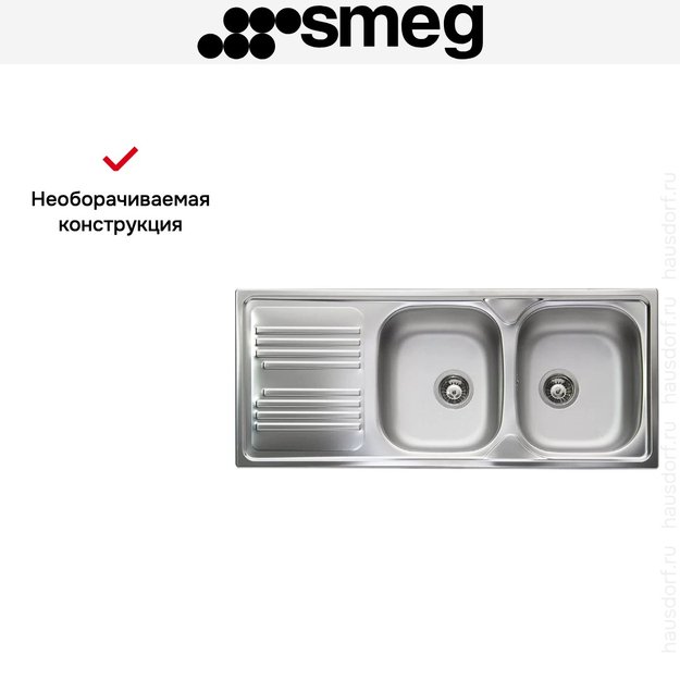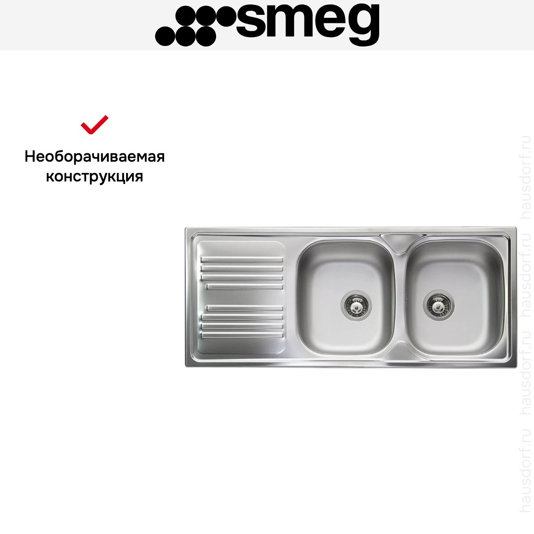 Прямоугольная мойка Smeg LYP116S сделана из нержавеющей стали, подходит любому дизайну кухни. Имеет две чаши глубиной 15 см, слева — крыло, на котором можно расположить сохнущую посуду. Благодаря сифону можно соединить мойку с посудомоечной или стиральной машиной.