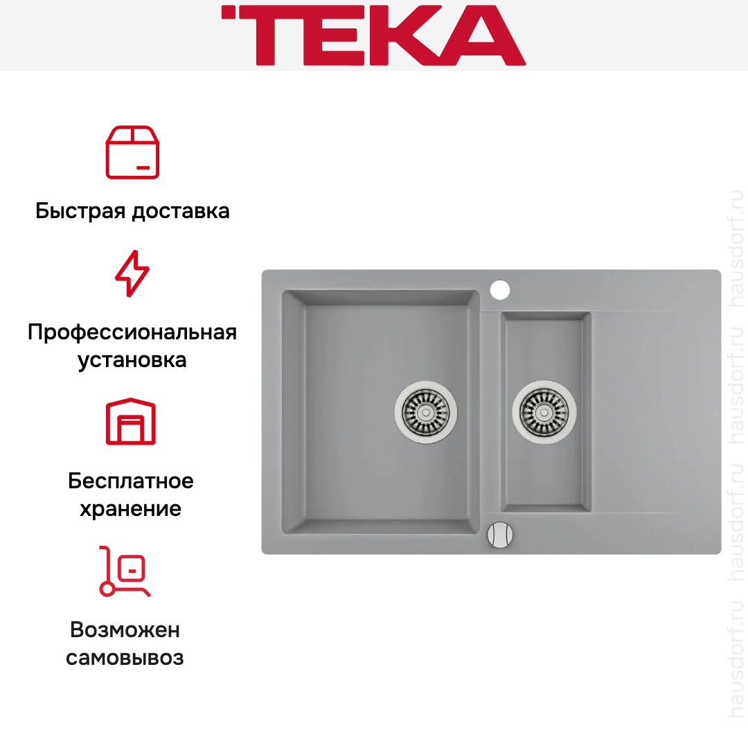 Мойка Teka Clivo 60 B-TQ Alugraumetallic представляет собой элегантное решение для современной кухни, которое сочетает в себе строгую прямоугольную геометрию, функциональную продуманность и спокойный серый оттенок поверхности. Изготовленная из прочного тегранита толщиной 9 мм, эта накладная модель рассчитана на установку над столешницей в базу шириной 60-80 см и обеспечивает удобство монтажа за счёт монтажного отверстия шириной 77,5 см; материал предлагает повышенную износостойкость, приятную тактильную шероховатость и стойкость к бытовым воздействиям, при этом сохраняя аккуратный внешний вид. Внешний дизайн выражен в линейных формах и компактных габаритах 80×45,9 см, которые позволяют сохранять свободное рабочее пространство. Конструкция оборачиваемая, поэтому можно выбрать расположение крыла с левой либо правой стороны в соответствии с планировкой кухни, а крыло служит удобной зоной для временной расстановки посуды или сушки. Основная рабочая часть состоит из одной большой чаши глубиной 19 см с размерами 34,5×19 см, дополненной второй мелкой чашей глубиной 11 см и размерами 16×11 см, что делает возможным сортировку и предварительную обработку посуды, а также удобное выполнение нескольких задач одновременно; наличие перелива предотвращает затопление и добавляет безопасности при интенсивной эксплуатации. Среди практичных элементов стоит отметить два отверстия под смеситель, что даёт свободу выбора смесителя с дополнительными функциями, и диаметр сливного отверстия 3 1/2 дюйма, совместимый с распространёнными комплектами слива и клапаном-автоматом, который уже входит в комплект вместе с необходимыми крепежами и сливной арматурой, обеспечивая полную готовность к подключению сразу после установки. Эргономика конструкции предусматривает оптимальную глубину для удобного мытья крупной посуды и компактные габариты для установки в стандартную кухонную группу; при этом дизайн Clivo подчёркивает аккуратность линий и сдержанность оттенка, что позволяет интегрировать изделие как в минималистичные, так и в классические интерьеры. Монтаж над столешницей упрощает замену и обслуживание, а продуманная геометрия чаш и скругления облегчают уход, снижая необходимость в агрессивной чистке; тегранитная поверхность устойчива к царапинам и высоким температурам, а толщина стенок гарантирует долговечность и стабильность формы. В комплекте поставляются все элементы для установки, включая крепёж и комплект сливной арматуры с автоматическим клапаном, что экономит время и исключает необходимость подбора дополнительных деталей. Эта модель подходит для тех, кто ценит рациональность планировки, надёжность материалов и сдержанную визуальную эстетику в сочетании с практическими решениями для ежедневной эксплуатации, при этом артикул 40148021 поможет быстро найти нужную позицию в каталоге и оформить заказ с учётом всех необходимых параметров; изделие отражает сбалансированный подход к качеству, удобству и внешнему виду, отвечая потребностям современной кухни в компактных и функциональных решениях. мойки Teka Clivo мойки Teka Clivo