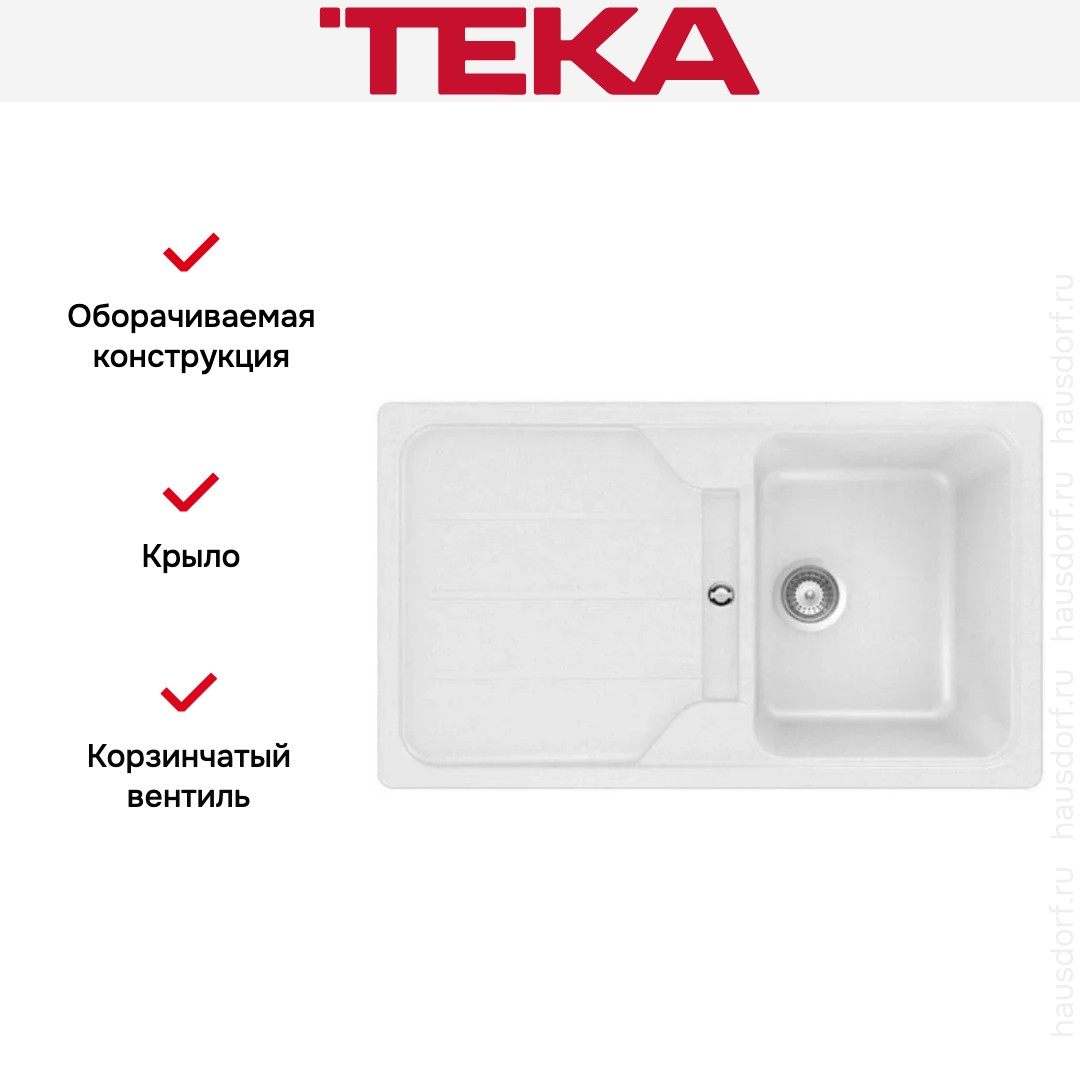 Обратите внимание на дизайнерские отличия мойки Тека, которые помогут в создании идеальной кухни в вашем доме. Она выполнена в цвете белый. Крыло, расположенное слева или справа, является дополнительным рабочим пространством, на котором можно сушить посуду, разделывать мясо и нарезать овощи.