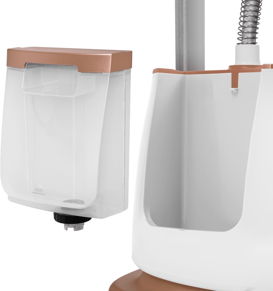 Профессиональный утюг подсоединен к емкости с водой, расположенной в корпусе с подставкой. Вы можете использовать такой утюг как на горизонтальной доске для глажки, так и при обработке вещей на вешалке.