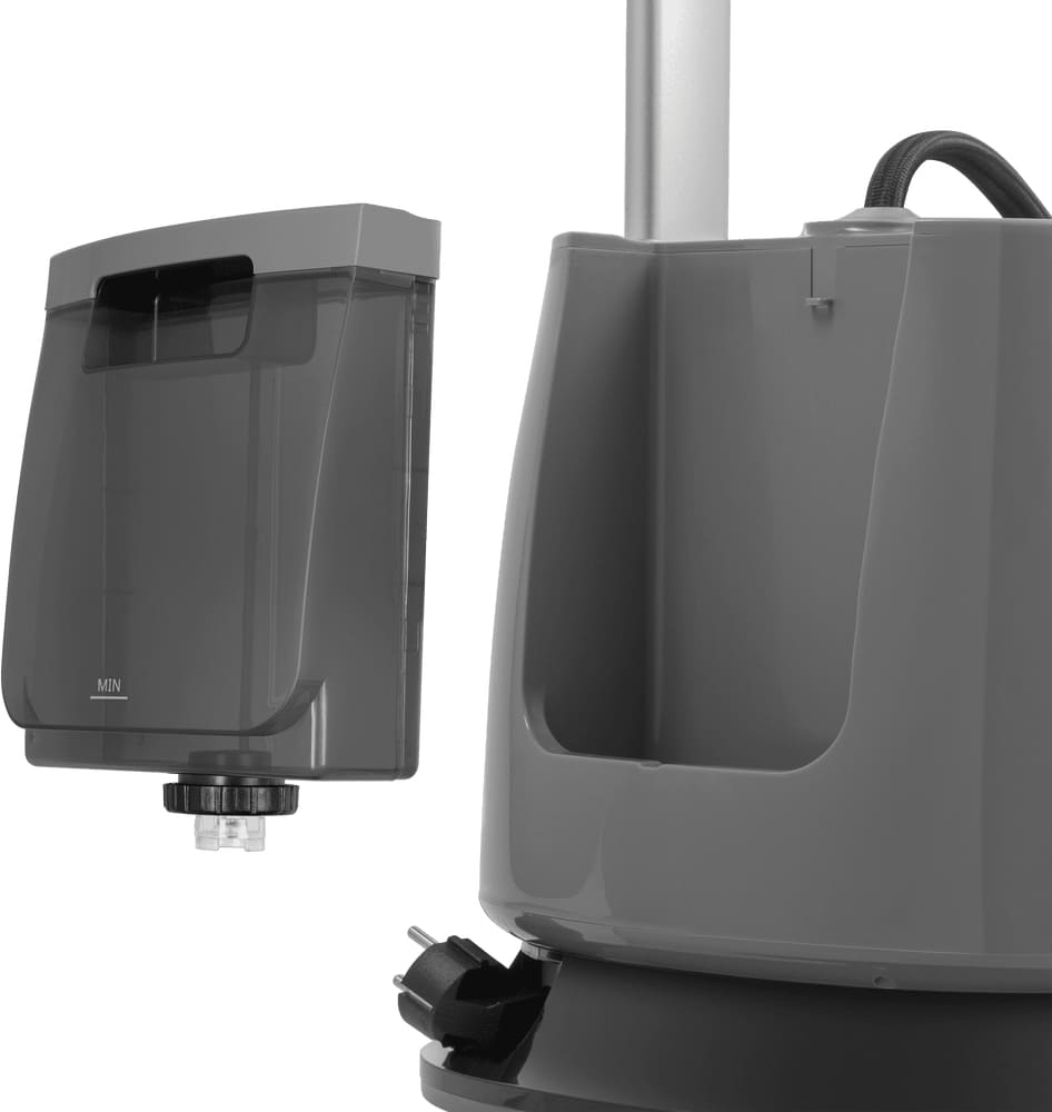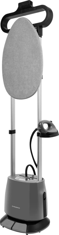 Профессиональный утюг подсоединен к емкости с водой, расположенной в корпусе с подставкой. Вы можете использовать такой утюг как на горизонтальной доске для глажки, так и при обработке вещей на вешалке.