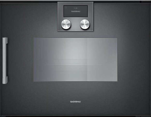 Gaggenau BSP220101 — встраиваемая пароварка с внешней генерацией пара. Управляется с помощью поворотных регуляторов и сенсорного TFT-дисплея, где отображаются индикаторы уровня воды и фактической температуры. Полезные режимы устройства: влажность 100%, сувид, брожение, разморозка, низкотемпературное приготовление.