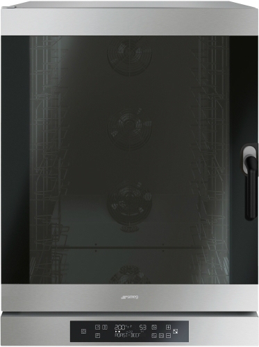 Smeg ALFA1035EHT — многофункциональная конвекционная печь с электронным управлением и TFT дисплеем, с помощью которого можно следить за работой устройства и настраивать параметры. Приготовление возможно сразу на 10 уровнях. Предусмотрено множество полезных функций, в том числе предварительный нагрев рабочей камеры до заданной температуры, подогрев готовых блюд и отложенный старт.