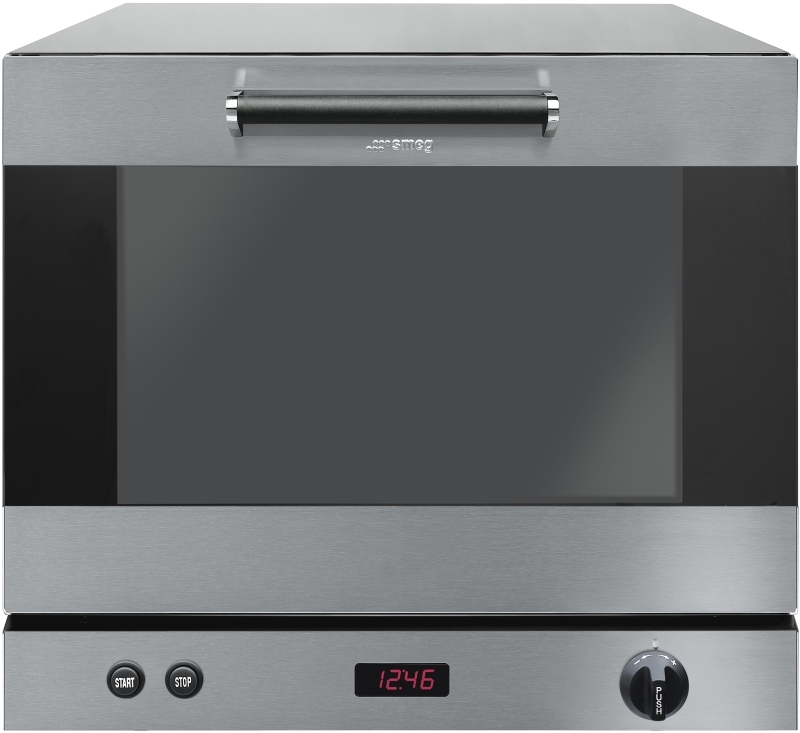 Конвекционная печь Smeg ALFA 43 XE, или конвектомат, устанавливается в пекарнях, кафе, магазинах и других предприятиях питания и служит для выпечки и разогрева хлебобулочных изделий и кондитерской продукции. Модель имеет стандартные габариты — около 60 см по высоте, ширине и глубине, и 4 уровня приготовления: расстояние между уровнями составляет около 80 мм. Такие размеры позволяют использовать ее для приготовления хлеба, пирогов, булочек и т.п. в небольших количествах.