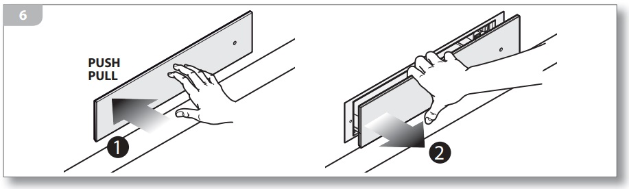 Открытие Push применяется в современных встраиваемых подогревателях посуды таких известных марок, как Smeg, Fulgor Milano, Kuppersbusch и ряда других премиальных брендов. Этот удобный способ позволяет конструировать встроенную технику без ручек, что позволяет легко открывать камеру, если руки заняты — например, нажимая на нее локтем. Такие фасады можно устанавливать встык в так называемом бесшовном дизайне, особенно при установке в колонну. В целях безопасности и для защиты механизма ящик при нажатии только приоткрывается, а затем его можно выдвинуть полностью, потянув на себя.