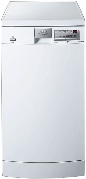 Отдельностоящая модель АЕГ отлично впишется в кухонный интерьер, главное — правильно выбрать место, чтобы подвести коммуникации. Имеет уменьшенную ширину — благодаря этому поместится даже на очень маленькой кухне. В камеру можно загрузить ограниченное число комплектов: 9 шт. Комплектом считается набор посуды на одного человека, который нужен для полноценного приема пищи: глубокая и плоская тарелки, тарелка для салата, блюдце под чашку, сама чашка, ложка и вилка.