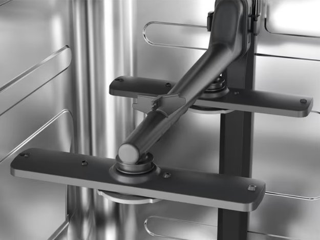 Как известно, принцип работы посудомоечной машины состоит в том, что на посуду в корзинах воздействуют сильные струи воды, которые подаются сквозь специальные форсунки во вращающихся разбрызгивателях-коромыслах. Класс мытья определяется, исходя из количества разбрызгивателей и форсунок, а также их диаметра — чем больше отверстий и чем меньше их диаметр, тем выше класс. Имеет значение также и расположение отверстий, так как струи воды не должны пересекаться — это мешает точности попадания в нужные места, а значит, и эффективности мытья. Кроме того, в камере не должно оставаться «слепых» зон, куда вода попадать не будет.