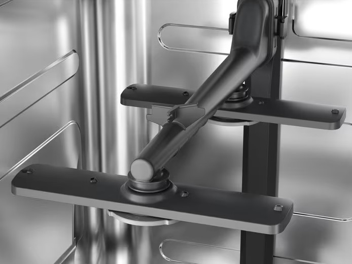 Как известно, принцип работы посудомоечной машины состоит в том, что на посуду в корзинах воздействуют сильные струи воды, которые подаются сквозь специальные форсунки во вращающихся разбрызгивателях-коромыслах. Класс мытья определяется, исходя из количества разбрызгивателей и форсунок, а также их диаметра — чем больше отверстий и чем меньше их диаметр, тем выше класс. Имеет значение также и расположение отверстий, так как струи воды не должны пересекаться — это мешает точности попадания в нужные места, а значит, и эффективности мытья. Кроме того, в камере не должно оставаться «слепых» зон, куда вода попадать не будет.