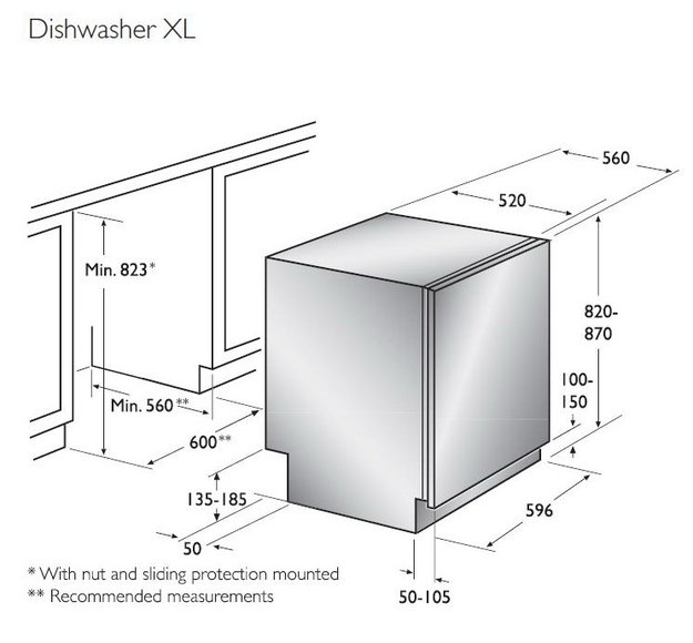 Большая часть полноразмерных и узких посудомоек встраиваемого и отдельностоящего вида имеет высоту около 82-85 см: такие модели легко размещаются под столешницей. Встраиваемые модели несколько ниже, так как у них отсутствует верхняя крышка.