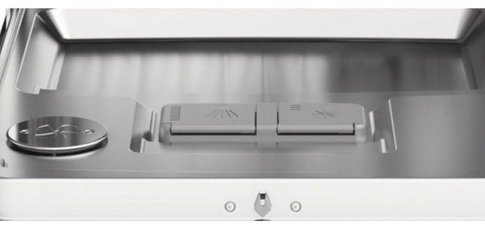 Среди восьми стальных элементов можно выделить: рабочую камеру, которая, кроме того, имеется всего один сварной шов, корзины с мелкой сеткой и направляющие для их выдвижения, трубки для подачи воды в камеру, разбрызгиватели, которые при вращении подвергаются значительным механическим воздействиям, фильтр тонкой очистки, основание, ножки и проточный нагревательный элемент. Кроме того, подобные машины не имеют резиновой манжеты, под которой часто образуется плесень, вследствие чего появляется неприятный запах.