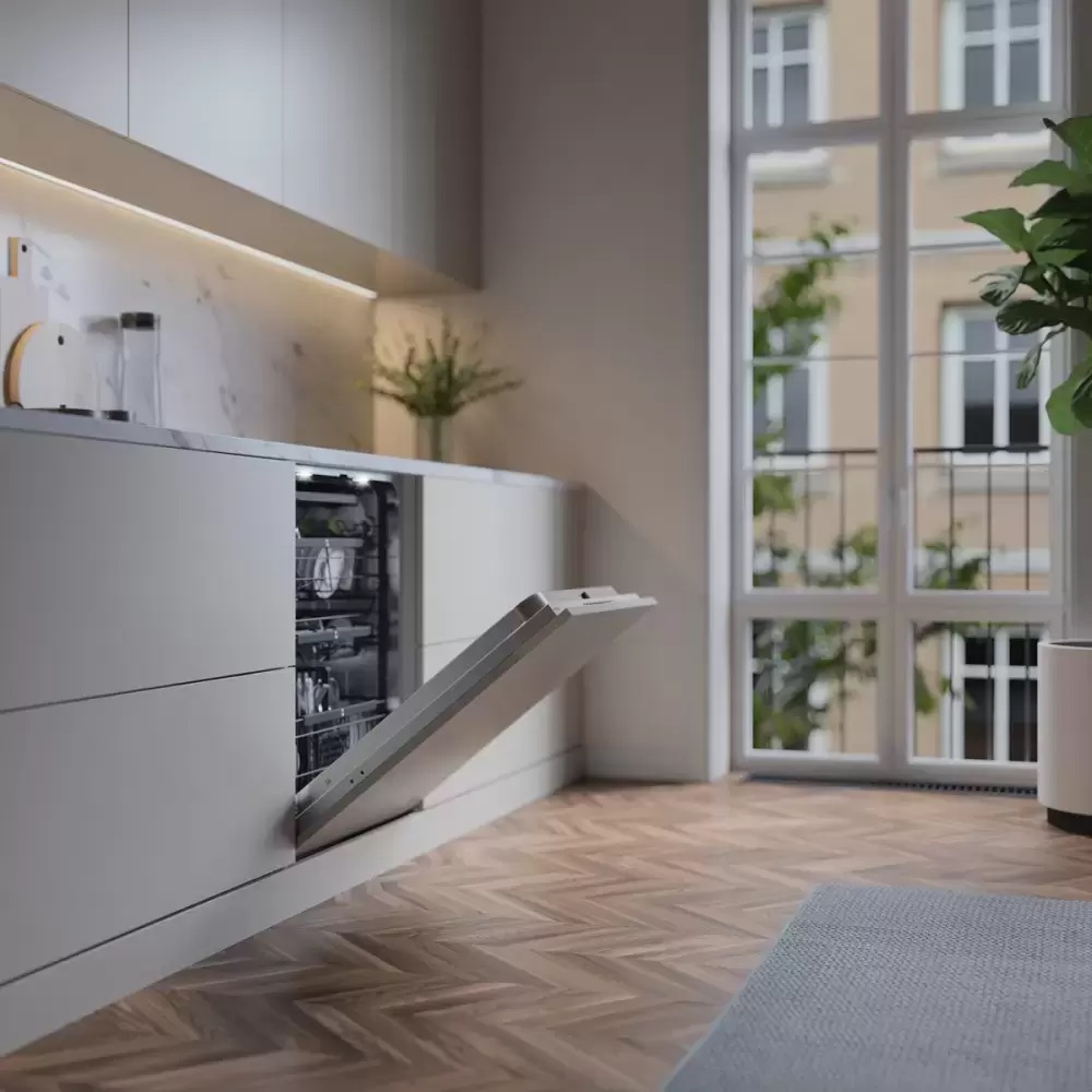 Полностью встраиваемая — посудомоечная машина закрыта мебельным фасадом, панель управления не на виду. Это повышает безопасность работы и облегчает подбор техники под дизайн кухни.