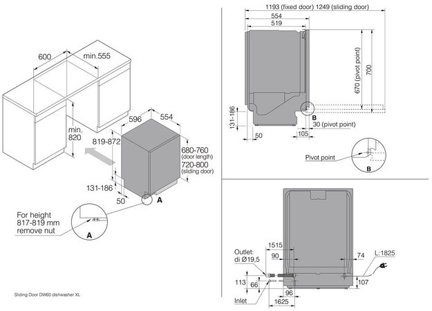 Большая часть полноразмерных и узких посудомоек встраиваемого и отдельностоящего вида имеет высоту около 82-85 см: такие модели легко размещаются под столешницей. Встраиваемые модели несколько ниже, так как у них отсутствует верхняя крышка.