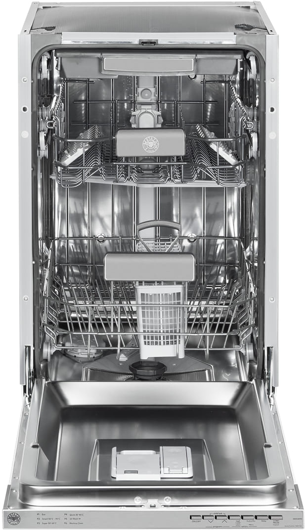 Встраиваемая модель Бертаззони отлично впишется в любой интерьер, главное — правильно выбрать место, чтобы подвести коммуникации. Устанавливается в нишу целиком, полностью закрывается декоративной панелью. Обратите внимание: в комплекте не идет фасад, его необходимо установить самостоятельно. Имеет уменьшенную ширину — благодаря этому поместится даже на очень маленькой кухне. В камеру можно загрузить ограниченное число комплектов: 14 шт. Комплектом считается набор посуды на одного человека, который нужен для полноценного приема пищи: глубокая и плоская тарелки, тарелка для салата, блюдце под чашку, сама чашка, ложка и вилка.
