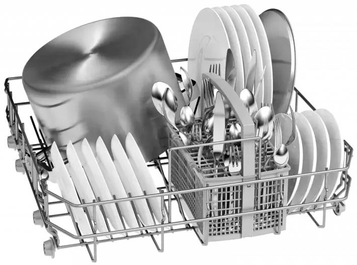 Корзина для столовых приборов — один из обязательных аксессуаров, которыми оснащается любая посудомоечная машина. Она представляет собой сетчатый пластиковый органайзер, в котором устанавливаются в вертикальном положении ложки, ножи и вилки. Корзина, как правило, разделяется на отдельные отсеки, в каждый из которых можно поместить один или несколько предметов. Зачастую сверху она закрывается специальной крышкой, которая также служит для разделения приборов, способствуя более тщательному их мытью.