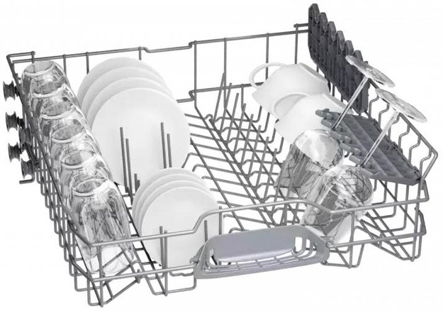 Устройство оснащено регулируемой по высоте корзиной для посуды, корзиной для столовых приборов и полочкой для чашек, что позволяет максимально эффективно использовать пространство внутри машины. В нижнем коробе находятся направляющие для тарелок. Также имеется отсек «Dosage Assist» для оптимальной дозации моющего средства.