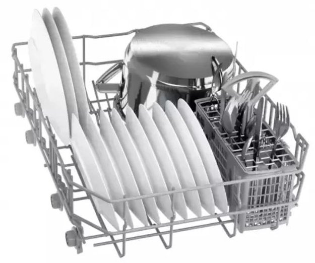 Корзина для столовых приборов — один из обязательных аксессуаров, которыми оснащается любая посудомоечная машина. Она представляет собой сетчатый пластиковый органайзер, в котором устанавливаются в вертикальном положении ложки, ножи и вилки. Корзина, как правило, разделяется на отдельные отсеки, в каждый из которых можно поместить один или несколько предметов. Зачастую сверху она закрывается специальной крышкой, которая также служит для разделения приборов, способствуя более тщательному их мытью.