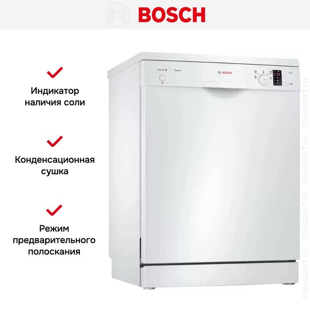Посудомоечная машина Bosch SMS25AW01R — это полноразмерная отдельностоящая модель, которая сочетает в себе стильный дизайн и функциональность. Обладает габаритами 84.5×60×60 см и вмещает до 12 комплектов посуды, что делает ее идеальным выбором для больших семей или тех, кто любит приглашать гостей.