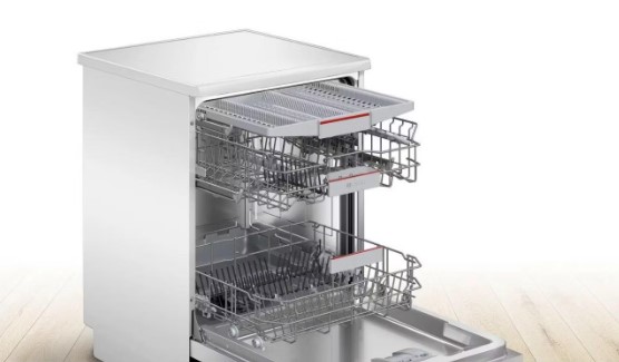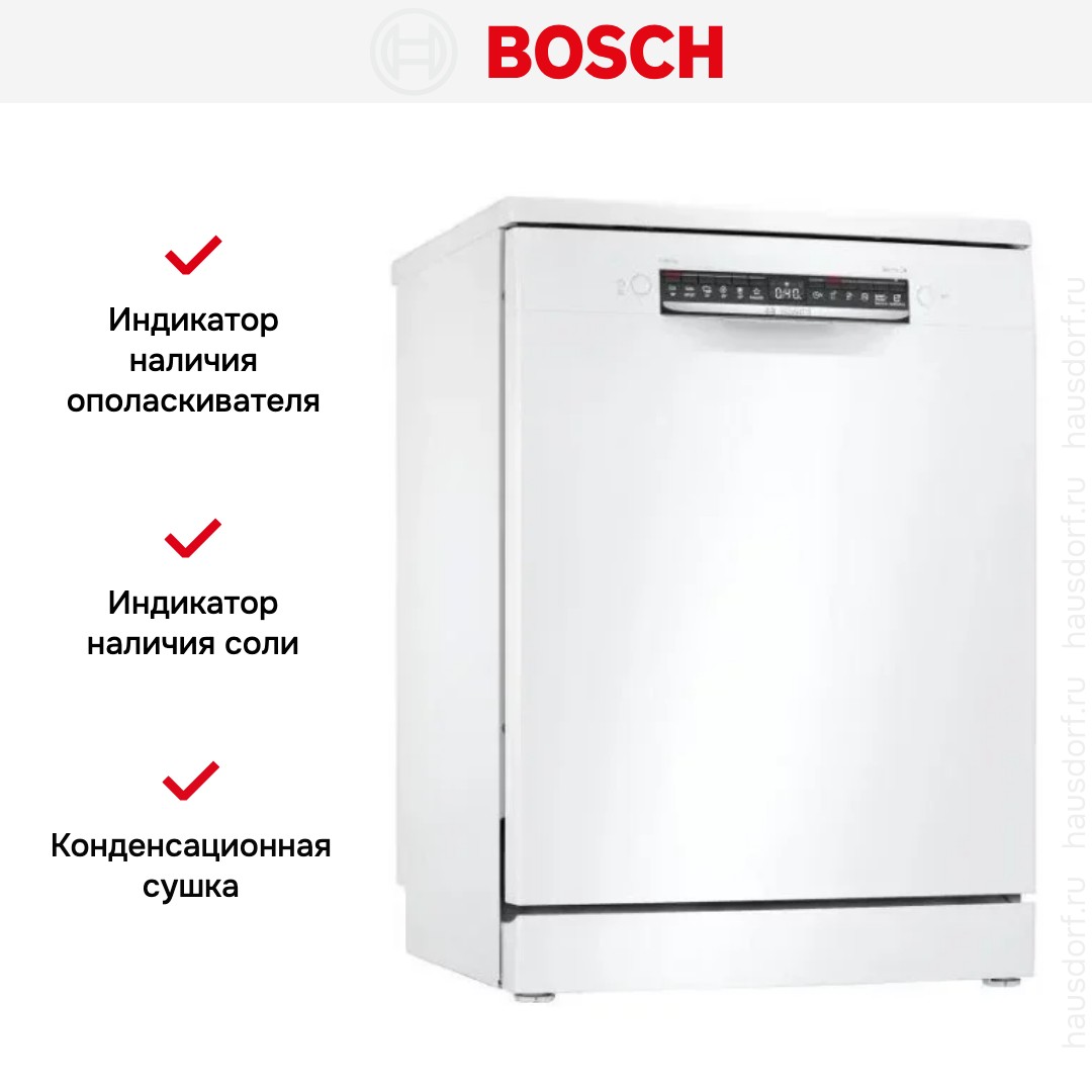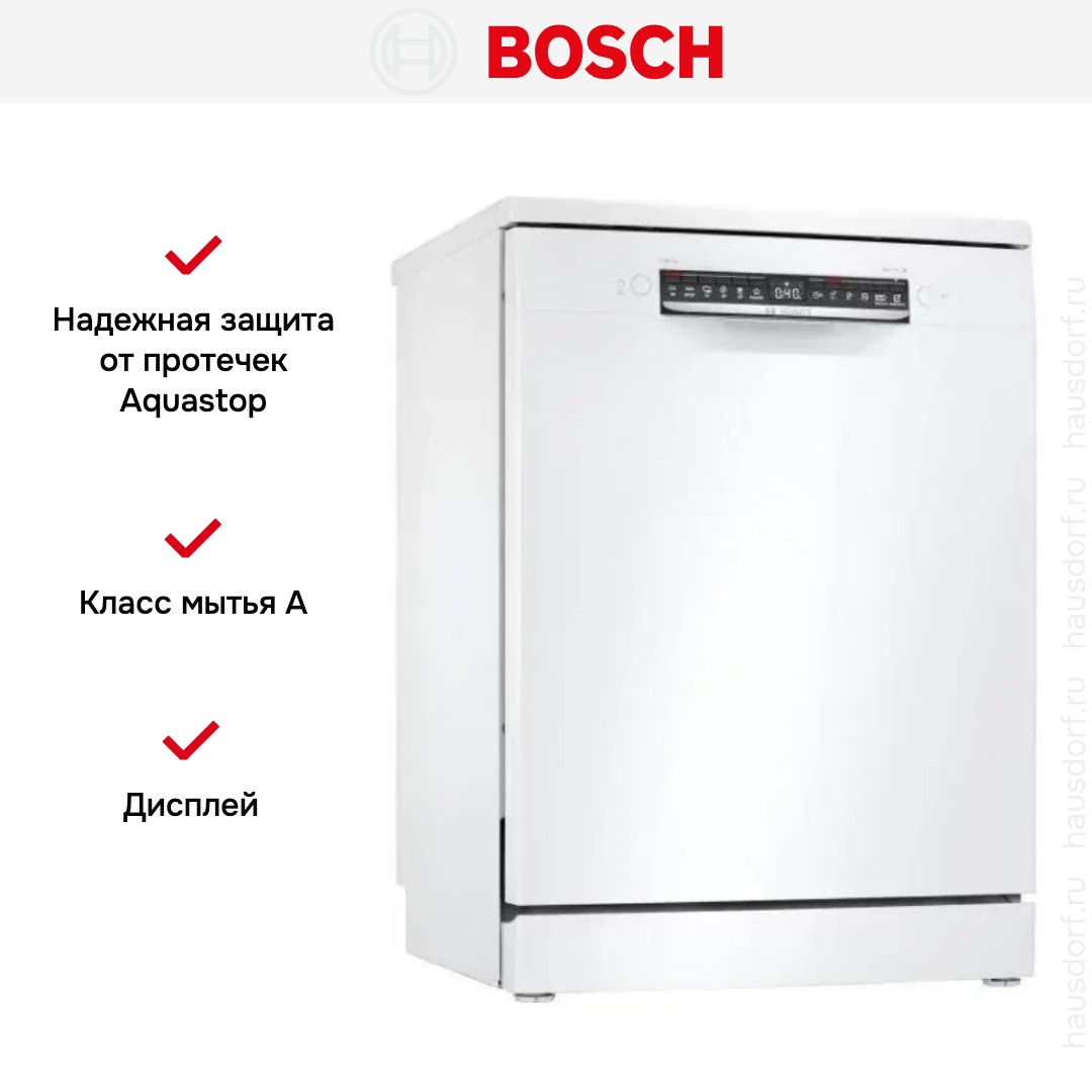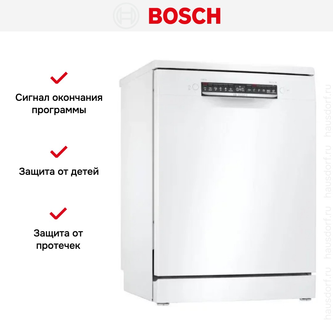 Отдельностоящая модель Бош отлично впишется в кухонный интерьер, главное — правильно выбрать место, чтобы подвести коммуникации. Имеет стандартные размеры, поэтому может не поместиться на очень маленькой кухне. В камеру можно загрузить ограниченное число комплектов: 13 шт. Комплектом считается набор посуды на одного человека, который нужен для полноценного приема пищи: глубокая и плоская тарелки, тарелка для салата, блюдце под чашку, сама чашка, ложка и вилка.